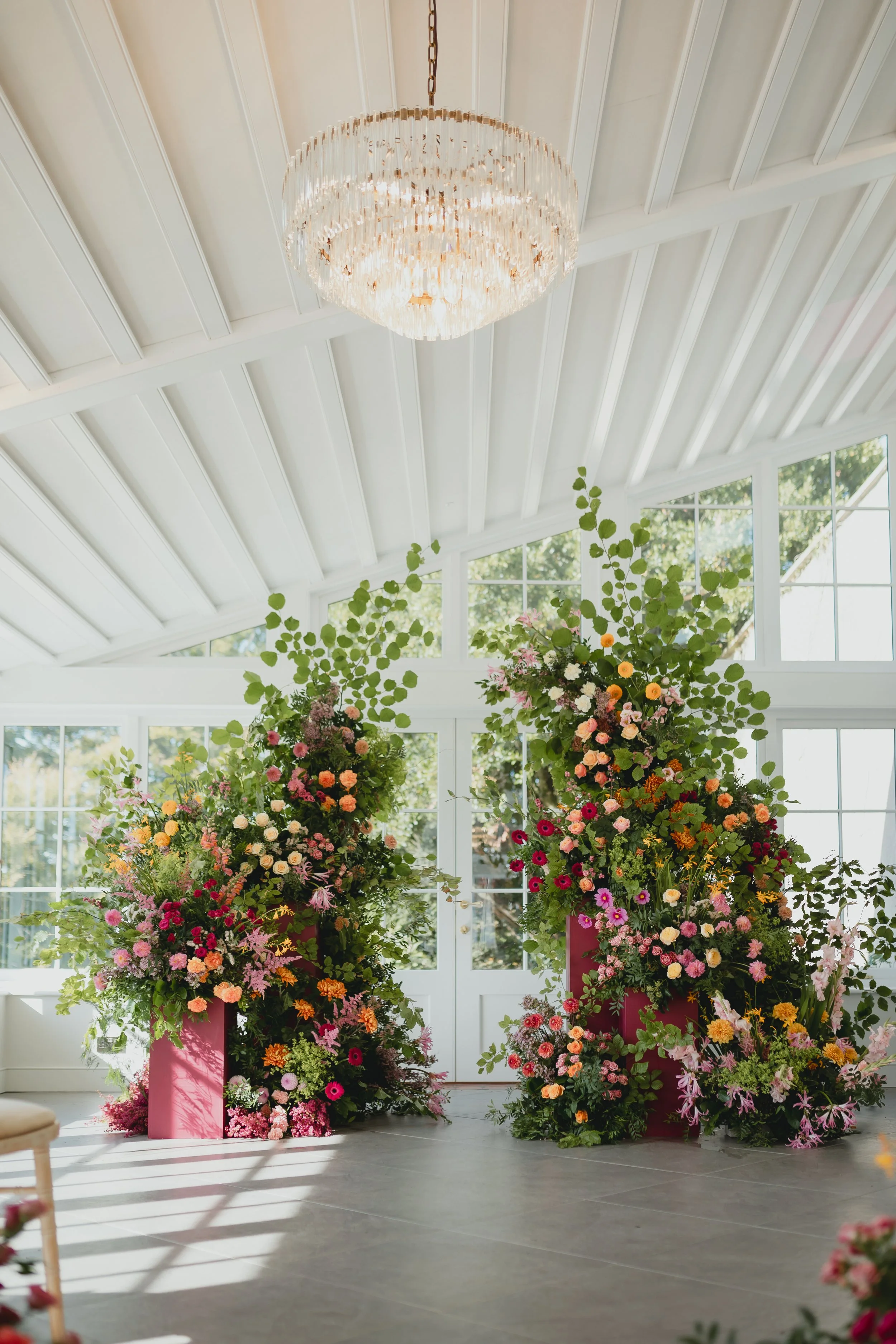 Couples often ask me where they should spend their money when it comes to the florals for their wedding days. All too often, couples will try to make their budget stretch across the whole day - the result is some lovely flower arrangements but it can feel a bit lacklustre and bare. Really what you want to think about is where the main photos are going to be taken. In most cases, this is where people arrive e.g. the entrance to the venue, the ceremony (specifically behind where you will be standing or sitting) and also the reception (especially behind where the speeches will be made).